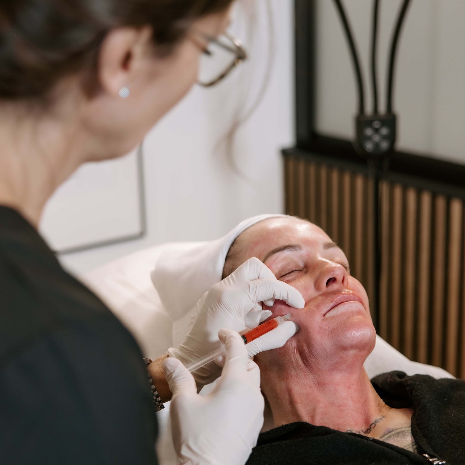 - Microneedling med PRF-indslusning: PRF tilføres via et lukket system direkte under microneedling-nålene. Det sikrer, at vækstfaktorerne indsluses præcist, mens mikrokanalerne stimulerer hudens naturlige regenerering.